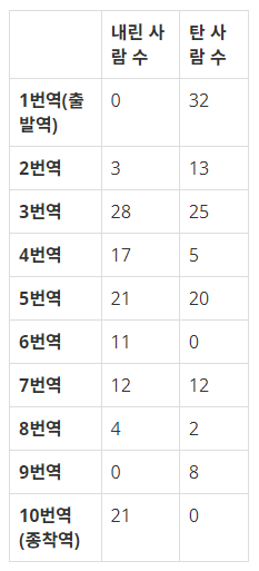 - 출발역에서 내린 사람 수와 종착역에서 탄 사람 수는 0이다.